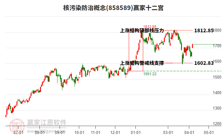 当天概念小幅下跌0.24%,目前受到58日前形成的上涨结构顶部线1812.85点压制,本轮自前方低点4月3日1640.34点,上涨至今日已持续7日,多方能量得到释放,空方能量逐渐增强。依据赢家十二宫结构规则,概念若不能有效突破站稳上涨结构顶部线,多方能量逐渐衰竭,空方能量逐渐主导,向下方警戒线1602.83点附近寻找新的平衡位。若向上突破站稳顶部线1812.85,有望突破前期形成的高点。