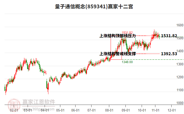 概念自近期高点1580.88跌至今日1494.75点,共下跌86.13点,跌幅5.76%,当前概念处于2025年8月25日形成的上涨结构顶部线与警戒线之间。依据赢家十二宫多空能量守恒规则,若多方能量再度聚集发力上攻,有望再度上攻关注结构顶部线1531.82点寻找平衡位;若跌破警戒线,空方继续主导,则将进一步下探结构底部线1348.0点寻找平衡位。