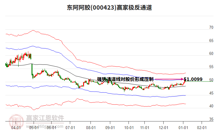 东阿阿胶(000423)根据赢家江恩极反通道趋势工具展示,上方压力位48.6007,下方支撑位44.9342。东阿阿胶(000423)处于赢家江恩空头中期反弹形态,从1月6日形成顶分型后持续下跌,重心