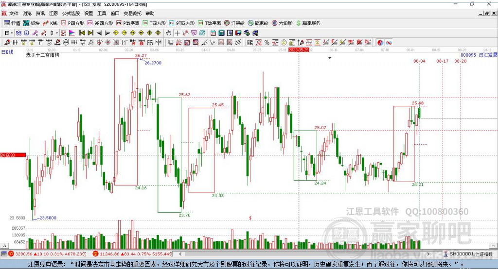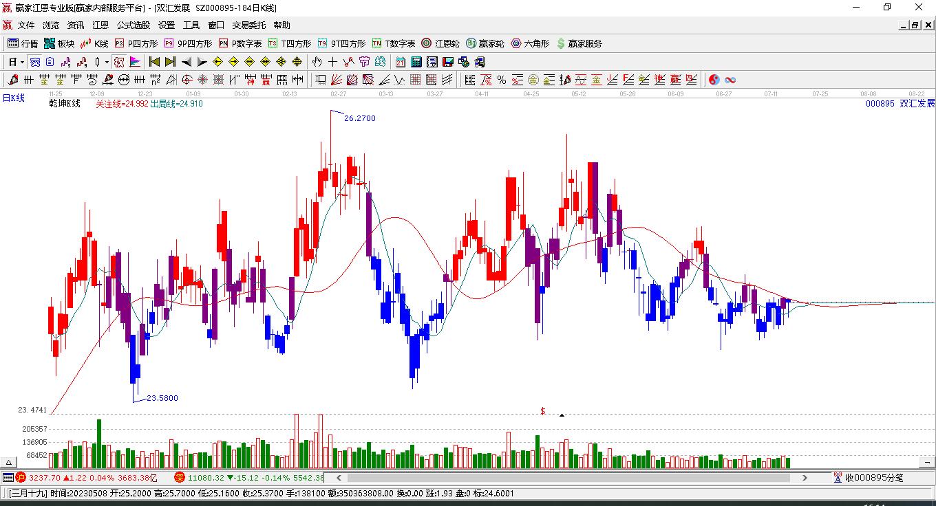 当天双汇发展最高价26.44挑战了赢家极反通道工具生命线,受到生命线强力压制,最终收盘停留在在生命线与蓝色下轨线上方的弱势通道区域。双汇发展近10个交易日涨幅2.41%。