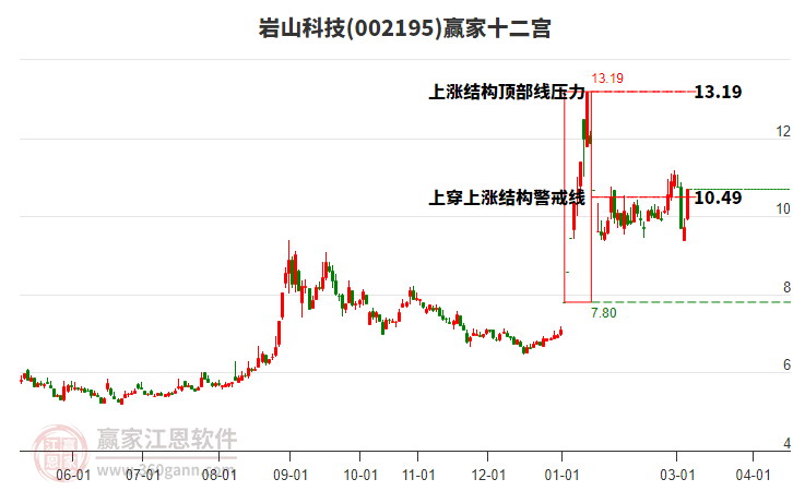 3月13日股价处在2026年1月15日形成的上涨结构底部线与警戒线之间,今日股价微涨1.46%,目前处于底部线上方。依据赢家十二宫多空能量守恒规则,上涨结构底部线位置是多空能量转换的一个关键位置。如底部线7.8支撑不破,由多方能量主导上攻,在警戒线10.49寻找多空能量平衡。如跌破底部线,空方动能占据主导,打开新的下跌空间。
