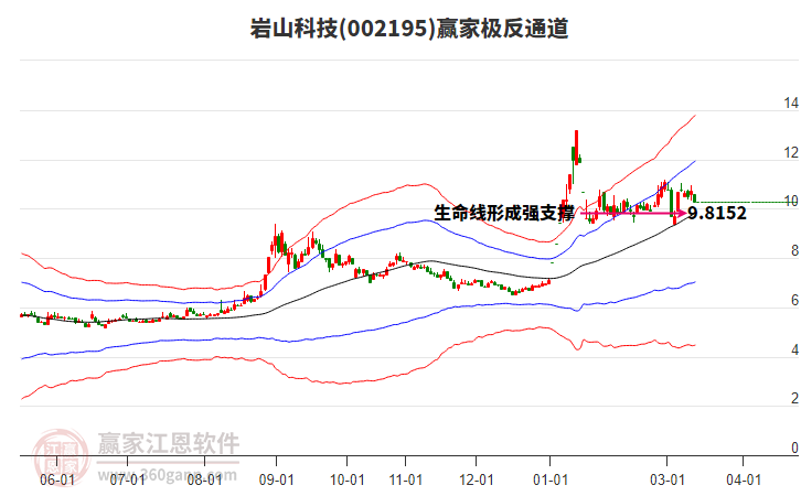 当天岩山科技最高价10.95上穿了赢家极反通道工具蓝色外轨线,受到蓝色外轨线强力压制,最终收盘停留在在蓝色外轨线与生命线上方的强势通道区域。岩山科技近10个交易日涨幅2.52%。