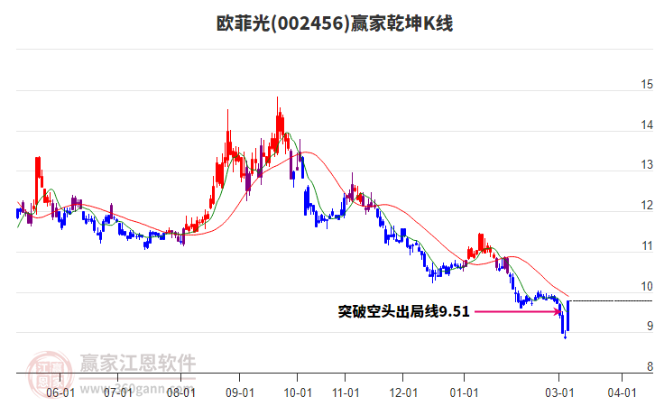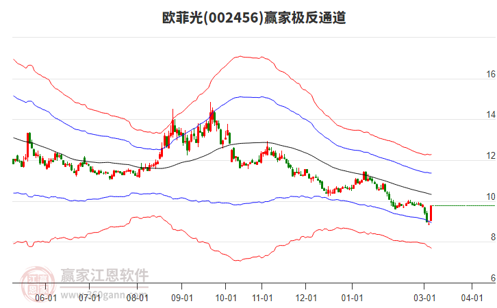 依据赢家江恩系统趋势工具极反通道分析判断欧菲光002456运行在生命线以下弱势区域,根据规则该股短线轻仓参与,股价跌至弱势外轨线后波段再结合其它工具信号建仓。应用口诀是:生命线上强势走,生命线下难抬头;红黄两条外轨线,压力支撑显势头。