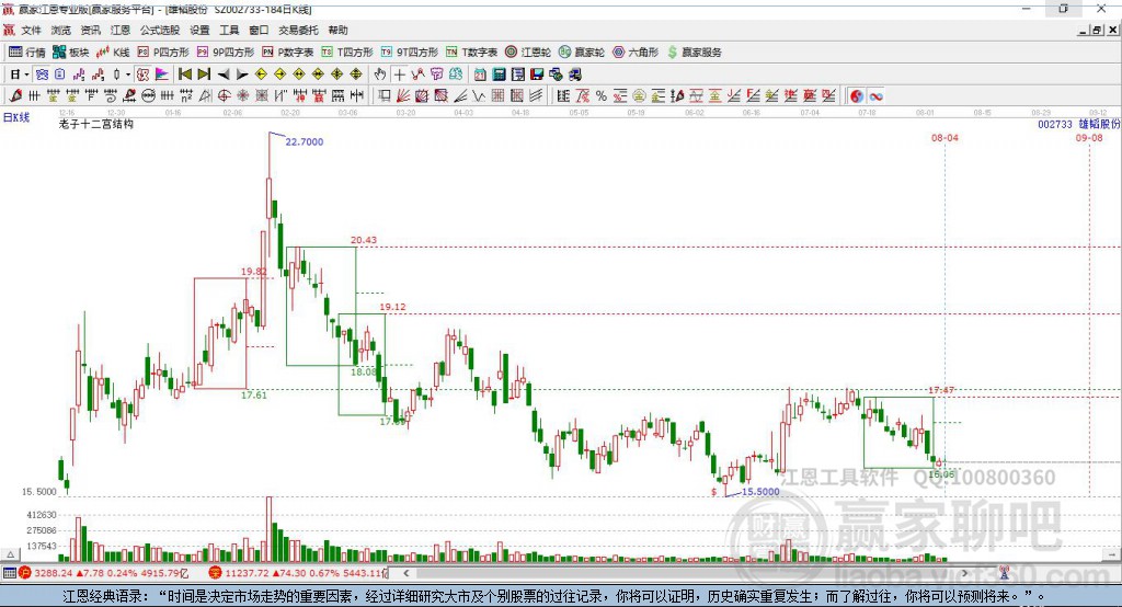 002733雄韬股份处于赢家江恩多头中期回调形态,12月26日发出江恩筑底信号后,经过45日,今日形成短期筑顶信号,短期多头趋势已被破坏,中长线均在空头下跌趋势中。002733雄韬股份根据赢家江恩极反