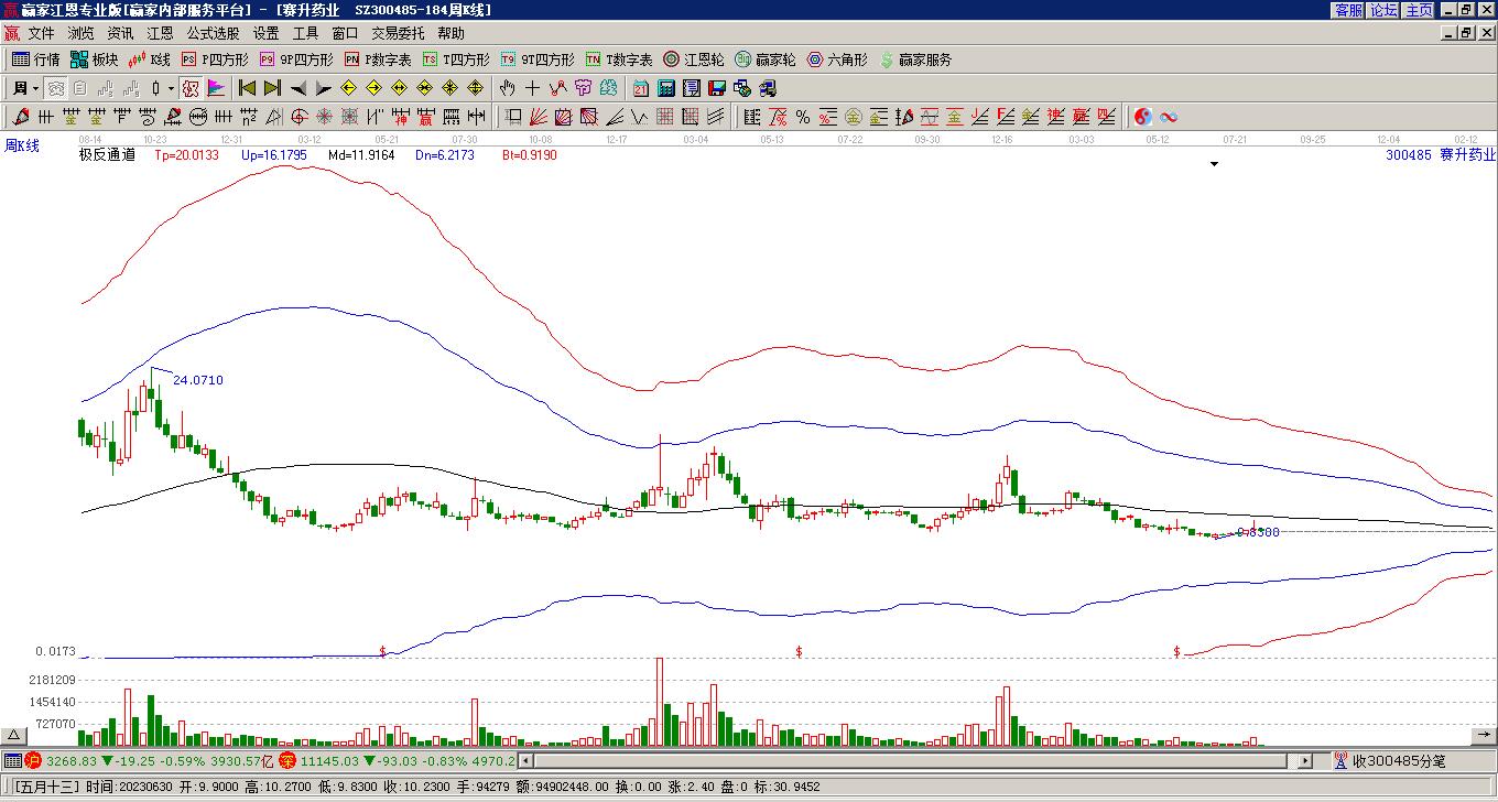 目前300485赛升药业最高价12.29挑战了赢家极反通道工具生命线,受到生命线强力压制,最终收盘停留在在生命线与蓝色下轨线上方的弱势通道区域。300485赛升药业近10个交易日涨幅3.21%。