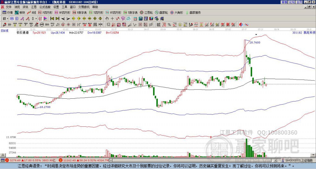 当天301182凯旺科技最高价46.01上穿了赢家极反通道工具蓝色外轨线,受到蓝色外轨线强力压制,最终收盘停留在在蓝色外轨线与生命线上方的强势通道区域。301182凯旺科技近10个交易日涨幅30.82