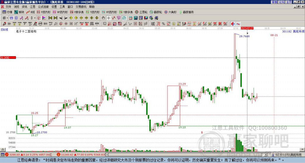 凯旺科技处于赢家江恩多头次主线形态,12月17日发出江恩筑底信号后,经过27日,今日形成短期筑顶信号,短期多头趋势已被破坏,中期虽然处于回调中,但长期多头趋势延续。凯旺科技目前K线为穿头破脚中阴线,且