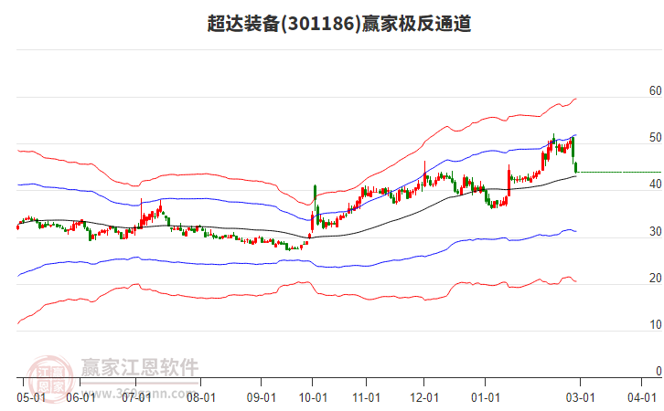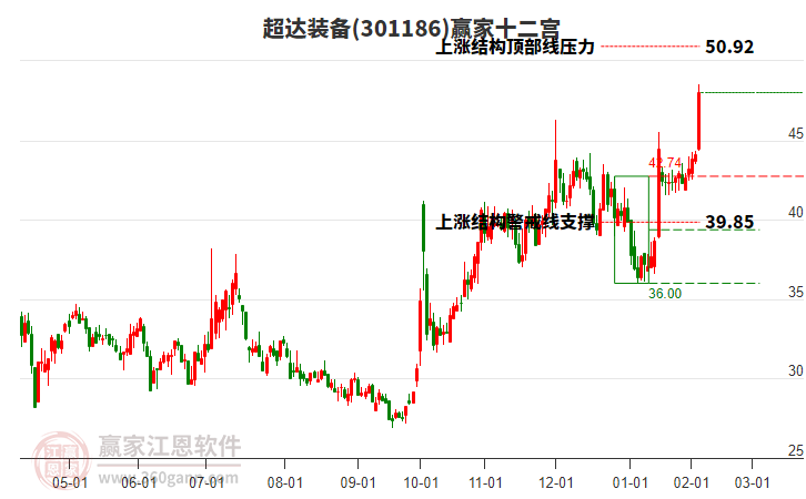 依据赢家江恩系统趋势工具极反通道分析判断超达装备301186运行在生命线以上强势区域,根据规则该股可短线、波段结合操作;结合物极必反的原理通过分钟图做盘中差价,应用口诀是:生命线上强势走,生命线下难抬头;红黄两条外轨线,压力支撑显势头。