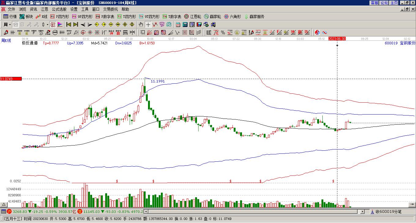 600019宝钢股份最高价上穿蓝色外轨线 小幅上涨3.48%