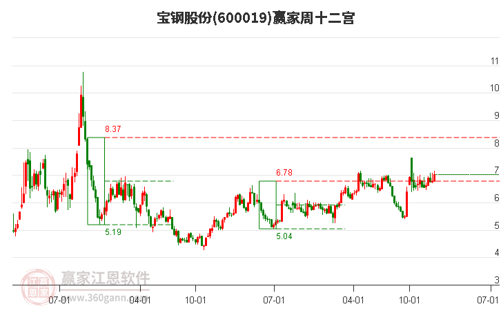 600019宝钢股份处于赢家江恩多头主线形态,10月24日发出江恩筑顶信号后,经过3日,今日再次发出江恩底分型并发出江恩筑底信号,中期多头趋势延续,但长期处于回调中。600019宝钢股份根据赢家江恩极