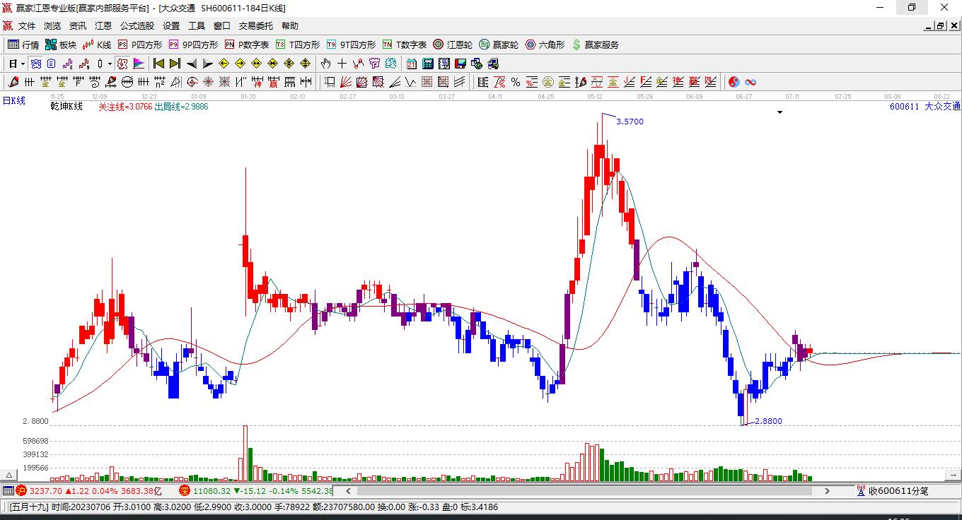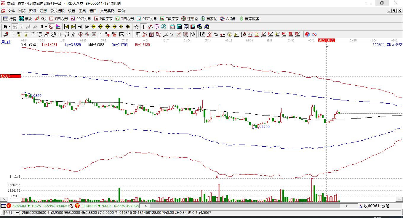 依据赢家江恩极反通道趋势工具展示,本周股价处于弱势通道内,近期自5月30日高点持续下跌至本周,跌幅达21.58%,依据赢家极反通道规则:站稳一线看高一线,短期关注此线支撑,如支撑不破,短线有望展开反弹挑战生命线。若跌破弱势通道线2.8135,进入超弱通道,打开下跌空间。