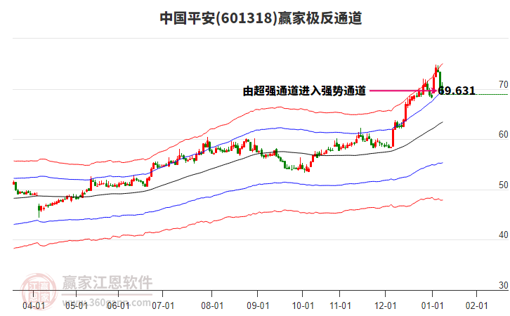 今天中国平安601318最高价73.0上穿了赢家极反通道工具上方红色外轨线,受到上方红色外轨线强力压制,最终收盘停留在在上方红色外轨线与蓝色外轨线上方的超强通道区域。中国平安601318近10个交易日