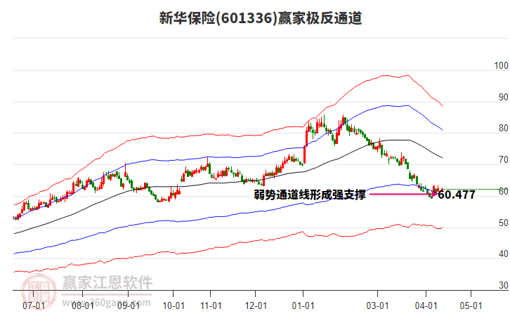 依据赢家江恩系统趋势工具极反通道分析判断新华保险601336运行在生命线以下弱势区域,根据规则该股短线轻仓参与,股价跌至弱势外轨线后波段再结合其它工具信号建仓。应用口诀是:生命线上强势走,生命线下难抬头;红黄两条外轨线,压力支撑显势头。