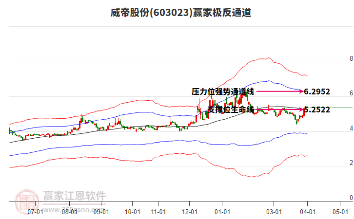 依据赢家江恩系统趋势工具极反通道分析判断*ST威帝603023运行在生命线以上强势区域,根据规则该股可短线、波段结合操作;结合物极必反的原理通过分钟图做盘中差价,应用口诀是:生命线上强势走,生命线下难抬头;红黄两条外轨线,压力支撑显势头。