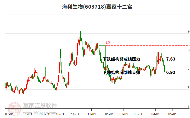 海利生物处于赢家江恩空头主线形态,今日重心下移,形成短期筑顶信号,从11月14日形成中期顶分型后中期重心持续下移,今日跌破前低形成初次筑顶信号,注意风险规避。海利生物K线为上下影小阴线,此K线说明盘中