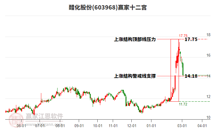 3月13日股价上穿13日前形成的上涨结构警戒线位置。依据赢家十二宫多空能量守恒规则,上涨结构警戒线是多空能量平衡点,突破或跌破往往意味着平衡打破。 当前股价若能站稳警戒线14.18,则有望再度展开上攻,往结构顶部线17.75寻找新的能量平衡点;若跌破警戒线14.18将再度下探,往结构底部线11.72寻找多空能量平衡点。