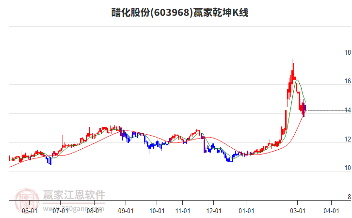 醋化股份603968涨至老子十二宫下跌结构警戒线上方区域内 近38个交易日涨幅46.68%
