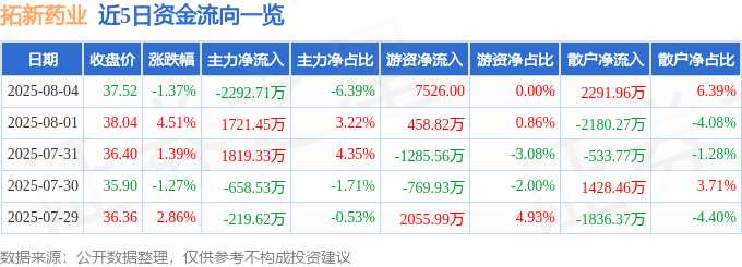 摘要: 消息,截至2025年8月4日收盘,拓新药业(301089)报收于37.52元,下跌1.37%,换手率10.66%,成交量9.7万手,成交额3.59亿元。8月4日的资金流向数据方面,
